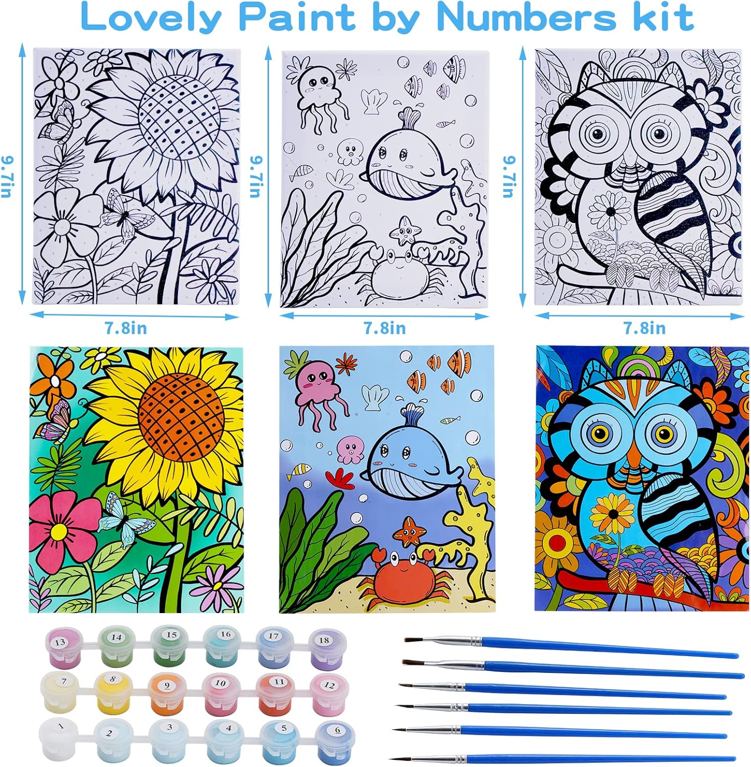 A fun and colorful paint-by-number set designed for young artists. With 3 framed canvases, 18 vibrant acrylic paints, and 6 brushes, this kit makes creative time easy, engaging, and perfect for kids who love arts and crafts.